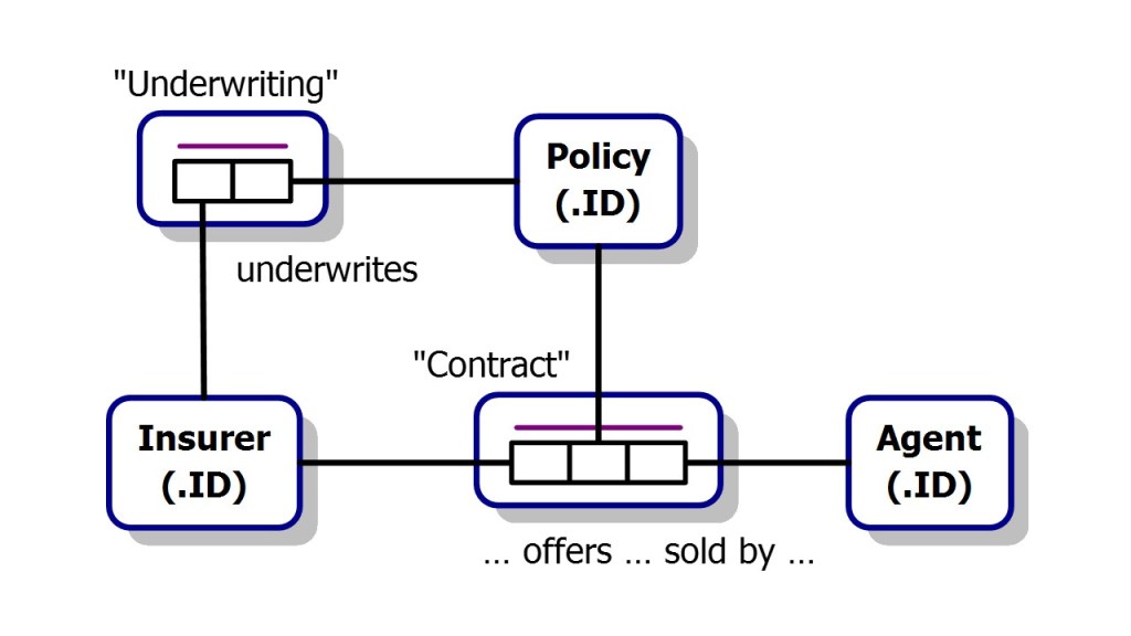 It is possible that for some Insurer and Policy, that Insurer offers that Policy sold by more than one Agent and that for some Insurer and Agent, that Insurer offers more than one Policy sold by that Agent and that for some Policy and Agent, more than one Insurer offers that Policy sold by that Agent. In each population of Insurer offers Policy sold by Agent, each Insurer, Policy, Agent combination occurs at most once. This association with Insurer, Policy, Agent provides the preferred identification scheme for Contract.