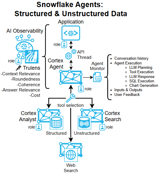 Snowflake Cortex Agents solve this through a three-tier architecture that automatically routes questions to the right data source: Cortex Analyst for structured database queries, Cortex Search for semantic document retrieval, and web search for external information. More importantly, every response is evaluated for accuracy and relevance through integrated TruLens observability.